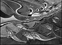 Colin has brought a new vitality to one of the earliest forms of printmaking. Although his work is based on the meticulous observation of the natural world, his talent is to invent compositions which distil the ecological and behavioural relationships of the species and their habitats. He uses his knowledge and imagination to construct engravings of great complexity and refinement and has evolved something new by the patterning and layering of his images. Later compositions, particularly those from an underwater viewpoint, use an increasingly abstract and fluid line to capture the fast and fleeting movements of birds and fish.
